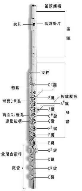 3笛頭管與身管的組合。握住笛頭管的中央,一面旋轉一面緩緩插入身管,同時將吹孔與身管#C鍵中央對正。